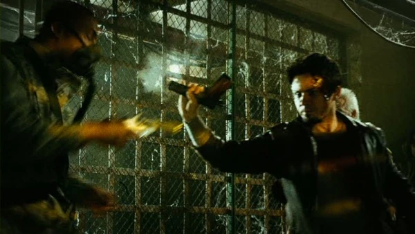Muldoon fires his 1911A1 at Abby when the deal for the "shit" goes bad. Which misses and hits the guy next to him.