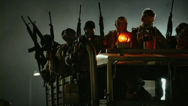 The soldiers, armed with M4A1 Carbine rifles, arrive at the army base.